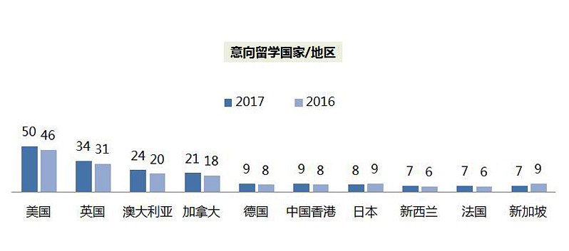 在留學國家的選擇上,美國連續(xù)三年仍是留學首選——50%的學生傾向選擇美國,英澳加緊隨其后,德國、中國香港、新西蘭和法國的占比較去年有小幅提升,留學目的國分布的整體格局較為穩(wěn)定。