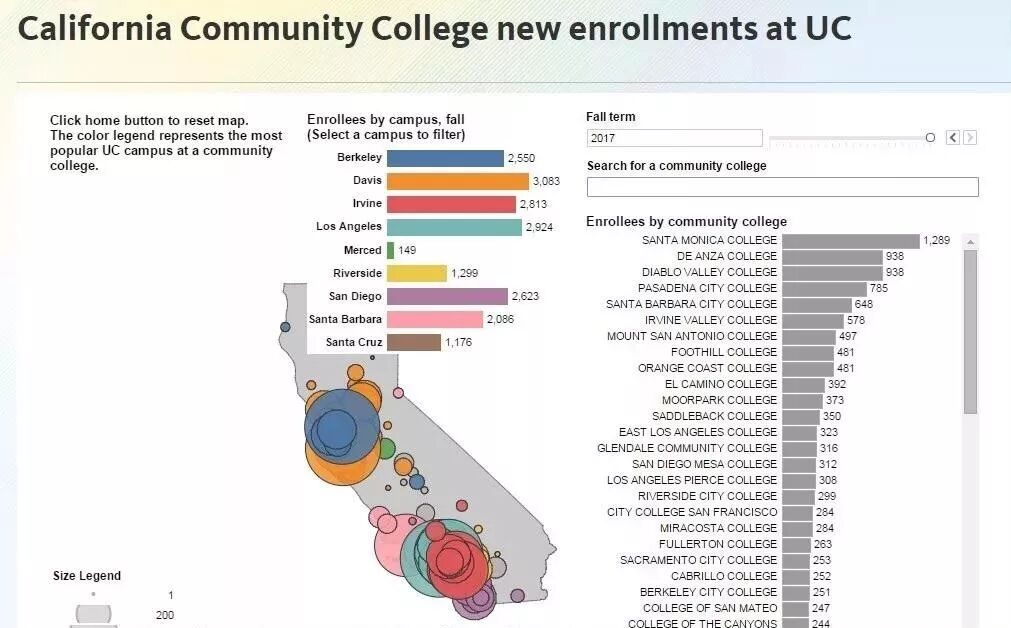 美國(guó)兩年制社區(qū)大學(xué)和四年制大學(xué)實(shí)行“2+2”轉(zhuǎn)學(xué)制度,大多數(shù)社區(qū)大學(xué)和四年制大學(xué)簽有轉(zhuǎn)學(xué)協(xié)議,從而確保社區(qū)大學(xué)的學(xué)分可以在四年制學(xué)位課程中得到承認(rèn)。美國(guó)一些名校每年都會(huì)招收一部分社區(qū)大學(xué)轉(zhuǎn)學(xué)的學(xué)生,對(duì)于很難直接被名校錄取的學(xué)生,選擇社區(qū)大學(xué)是升入名校的跳板。以下是根據(jù)UC官網(wǎng)統(tǒng)計(jì)的2017年秋季從加州各社區(qū)大學(xué)轉(zhuǎn)入加州大學(xué)的人數(shù):